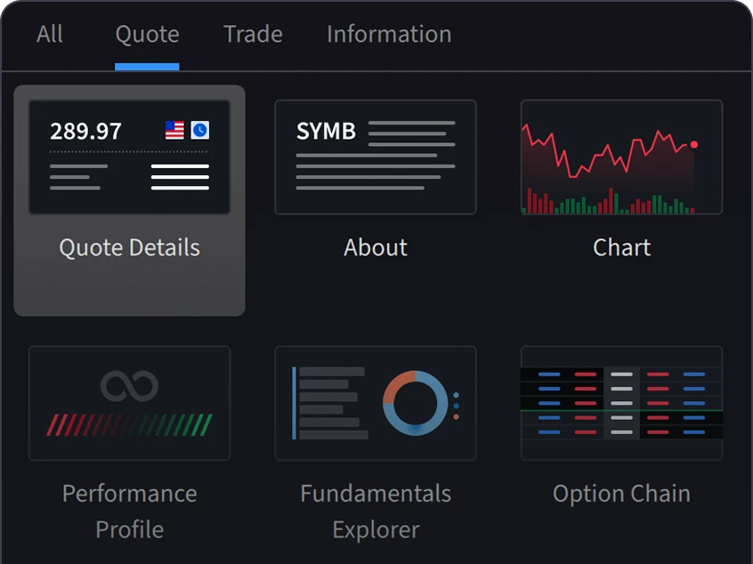 Start simple and add advanced tools as your strategy grows. Access dynamic market data, research, trading and portfolio monitoring all in one powerful workspace.